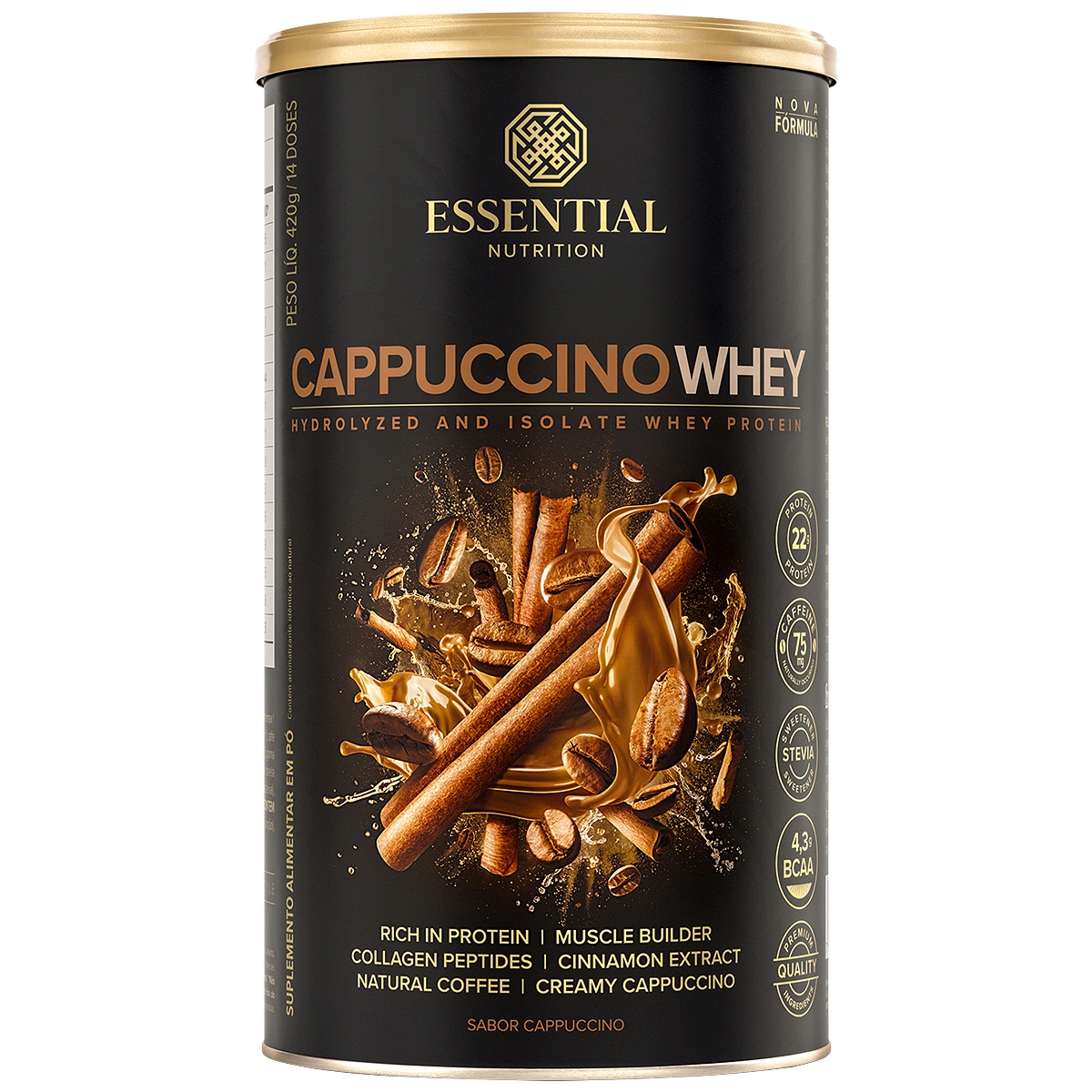 O Cappuccino Whey da Essential Nutrition é um suplemento alimentar rico em proteínas, que combina whey protein hidrolisado e isolado (obtidos através do processo patenteado CROSS-FLOW MICROFILTRATION, o qual purifica e preserva as propriedades das proteínas, resultando em uma melhor absorção). Cappuccino Whey também traz peptídeos de colágeno hidrolisado, café natural (com 75mg de cafeína), cacau e extrato de canela, e é adoçado apenas com estévia.